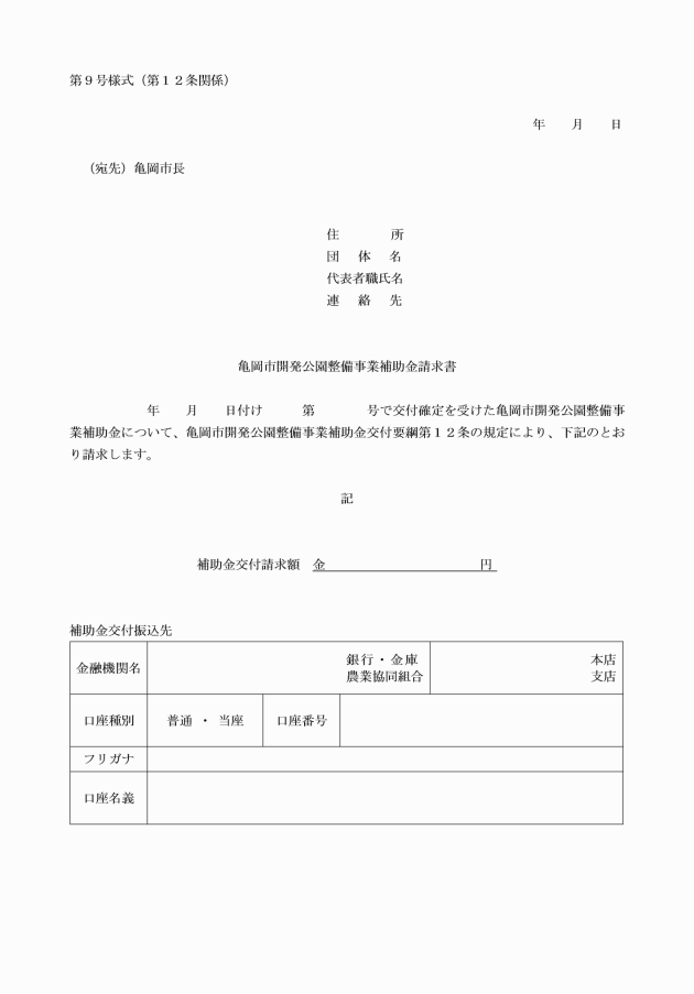 第7条 事業認定を受けた補助事業者は、亀岡市開発公園整備事業補助金交付申請書(別記第3号様式)に関係書類を添えて市長に提出しなければならない。