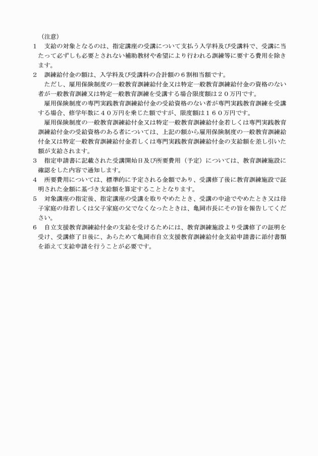 第5条 訓練給付金を受けようとする者(以下「申請者」という。)は、自らが受講しようとする講座について、亀岡市自立支援教育訓練給付金事業受講対象講座指定申請書(別記第1号様式)を市長に提出し、受講開始以前にあらかじめ対象講座の指定を受けなければならない。