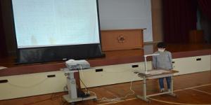 あいにく体育館にアクセスポイントがひいてないので、書画カメラやプロジェクターなどを使いながら、児童らは発信しました。クイズとして発問された問題に引き込まれたのか、映し出されるテレビサイズが小さいくよく見るためかは不明ですが、モニターに引き寄せられるように、みんなはそれぞれの「アタックノート」の発信に興味を持ってみていました。