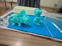 西別院小学校は、実技部会担当でしたので、「1年の図画工作、粘土つくり」。自分と一緒にお散歩をしたいものをイメージし、形取り作品にします。次回はその作品をコマ送りで画像撮影し、繋げて動画のようにして鑑賞することにチャレンジしています。粘土を粘土に貼り付けるのではなく、練って引き出したりしながら立体化し、その像が自立するように仕上げることも求められています。