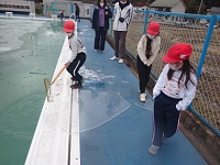 スコップや熊手レーキーで氷を割って、プールサイドに引き上げていました。氷は氷点下の状態で固まることを教えてもらいながら、0℃以下のものを素手で触ると冷たいのは当たりまえ。直ぐに指先は白く冷たくなってきました。今日も吹く風は少し肌寒く、冬ならではのプチ体験を楽しんできました。