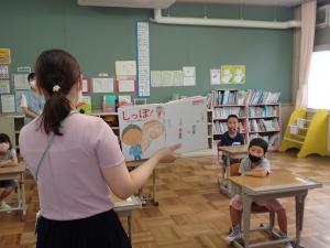 高学年は、頁をスライドショーとしてモニターに映し出し読み聞かせをし、低学年は集中して話がきけるように小さな本を前で提示しています。