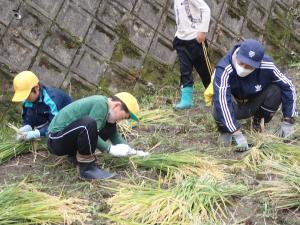 10月5日水曜日は朝から稲刈りの予定でした。昨晩の小雨の関係で稲が濡れ、田圃も少しぬかるみ滑る可能性もあり、衣服の濡れによるその後の学習環境の不快感や脚を滑らせ怪我をする可能性を鑑み、5,6校時の時間割と入れ替え、午後からの稲刈り作業となりました。