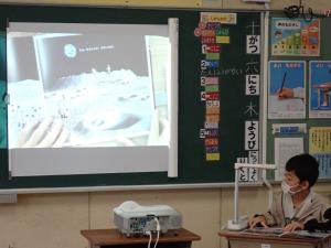 全校児童の前で、男児は書画カメラを使って提示しながら読みきかせをしてくれました。
