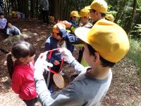 木漏れ日の落ちる山道、雑木林の木立と木立の間から垣間見える青空が綺麗です。新緑の香りや柔らかい緑は眼に優しく、森林浴が気持ちよい登山となりました。復路の倒木一本杉のポイントで記念写真を撮り、自然を遊具に見立てアスレチック的な活動を楽しみました。十分な時間もあり児童らは自然と戯れご満悦のようです。蔓のブランコも独占したりすることなく仲良く交替で楽しんで居ます。里山ならではの自然との触れ合いの一時が流れていきます。