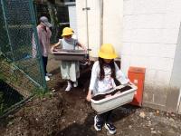 今回は異年齢集団の「なかよし班」ではなく、それぞれの学年に分かれて、学年で協力しながら、土を入れたり、ポットを運んできたり、植えたり、水をやったりしました。