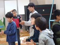 最後に、みんなで飛ばし方を教えていただき、体育館の中で飛ばして遊んでみました。夫々が満足そうな笑顔を浮かべています。貴重な体験をありがとうございました。早速、作品を各自の家に持ち帰りました。きっと、お家で自慢話に花が咲き空高く飛んでいっているでしょう。