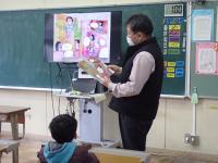 低学年は、校長先生による「だがし屋のおっちゃんはおばちゃんなのか?」/多屋 光孫(たや みつひろ)作 汐文社(ちょうぶんしゃ)の本の読み聞かせです。この1月に本校の蔵書となった新刊。