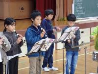 これまで音楽の授業で学習した「オーラリー」「ごんぎつね」「メリーさんのひつじ」の3曲を披露してくれました。3年生は、4年生に混じって小太鼓やトライアングルなどの打楽器を担当、「ごんぎつね」ではナレーターと歌を披露してくれました。4年生は、リコーダーにも慣れ、3年生をしっかりリードしながら上手に演奏することができました。