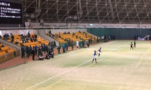 滋賀県立長浜バイオ大学ドームで近畿中学生ソフトテニス選抜インドア大会が開催され、京都府予選会を勝ち抜いた2年生1ペアが個人戦に出場しました。
