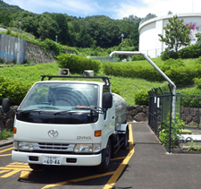 給水車から給水槽へ注水し、仮設給水拠点として使用します。