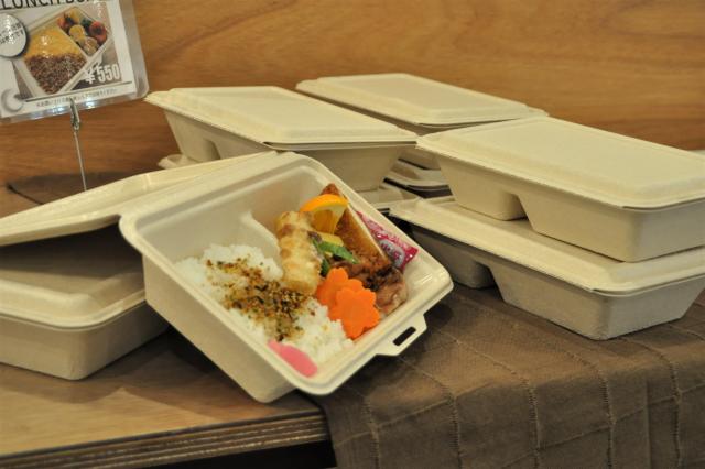 テイクアウト弁当の入れ物をはじめ、コーヒーなどドリンク用のカップ・フタ、ストローは、紙製またはサトウキビの搾りかすを原料とする環境にやさしい素材を採用。