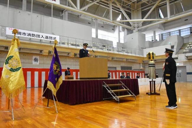 式典では、入団者や退団者への辞令交付、表彰状の伝達や永年勤続者および分団長の配偶者などへ感謝状が贈られ、桂川市長が「地域に密着した消防団の役割は非常に重要で、市民からの消防団に寄せる思いは高まっています。地域防災の要として、さらなる活躍を期待しています。」と式辞を述べました。