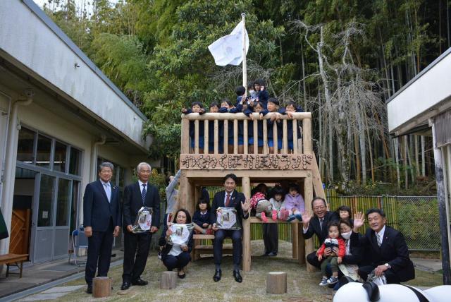 11月21日、本梅こども園で遊び場の完成を祝う完成式を行いました。記念撮影や園児たちからのお礼のプレゼント、歌の披露などがありました。この遊び場は、園児たちへの自然保育をより効果的に実施できる環境づくりのため、9月ごろから園児の保護者や地域の皆さんの協力のもと、竹柵や丸太のステップの設置、芝生張りなどの整備が進められたものです。