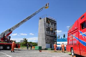 京都府総合防災訓練は、府下の市町村において毎年開催されており、令和5年度は亀岡市が訓練会場となりました。消防や自衛隊による救出訓練をはじめ、防災関係機関と地域住民が一体となった訓練を行うことで、関係機関の実践力の向上や相互の連携強化、住民の防災意識の高揚を図ることを目的としています。