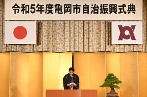 11月3日、亀岡市政にご功労いただいた方や市に対して善意の寄付をしていただいた方を表彰し、市民の皆様とともに感謝の意を表し、併せて市政のさらなる発展を期待して「令和5年度亀岡市自治振興式典」を開催しました。