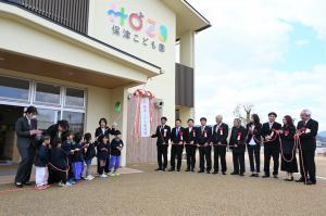 開園式では、関係者と5歳児がくす玉を割り開園を喜びました。また、受け継がれてきた地域への想いを込め作詞された園歌を、子どもたちが大きな声で歌いあげました。