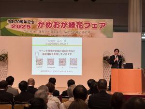 講演では、亀岡市の令和7年度の予算を中心に、現在進めている「全国都市緑化フェアin京都丹波」や「亀岡市市制70周年事業」などについてお話させていただきました。